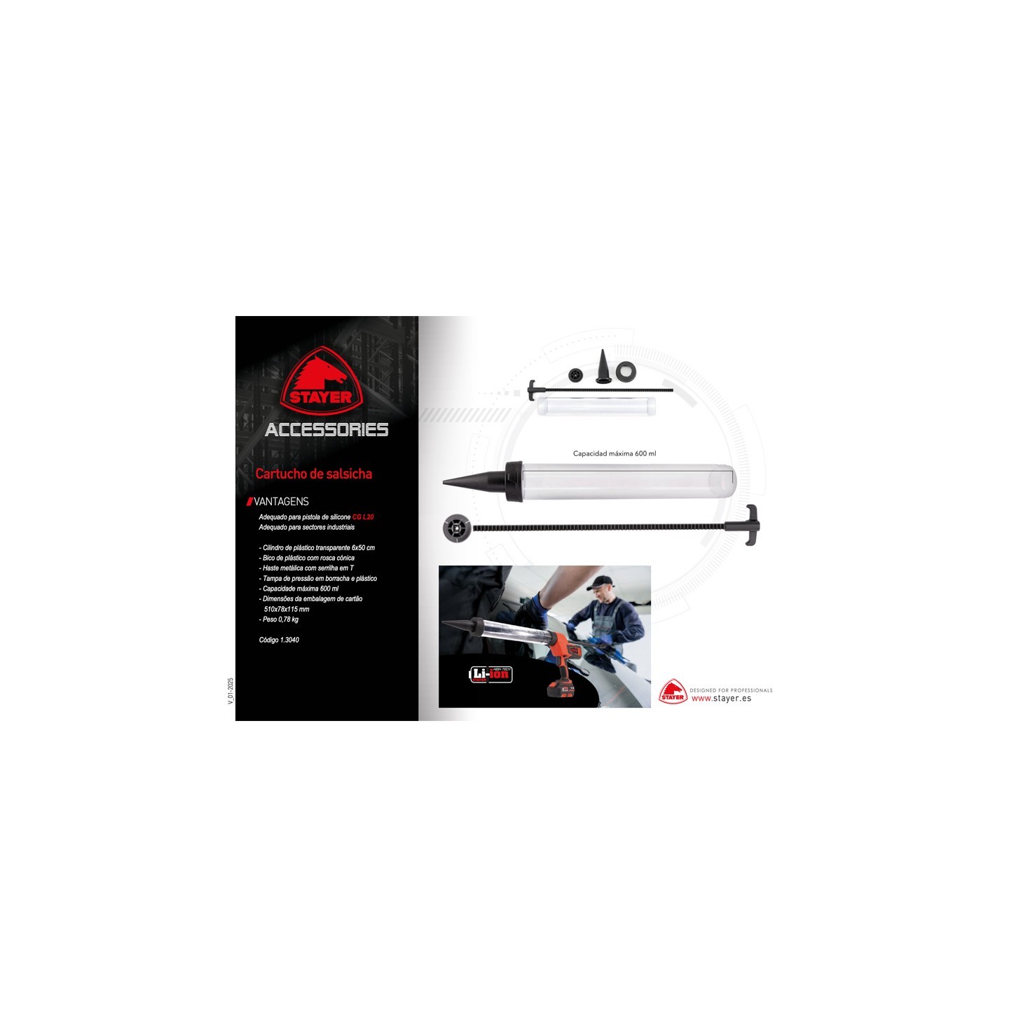 El cartucho para salchichas Stayer, compatible con la pistola CG L20, permite utilizar envases flexibles de hasta 600 ml, ampliando la capacidad estándar de aplicación. Este accesorio está orientado a profesionales que realizan sellados prolongados y necesitan mayor autonomía sin cambiar de carga con frecuencia.